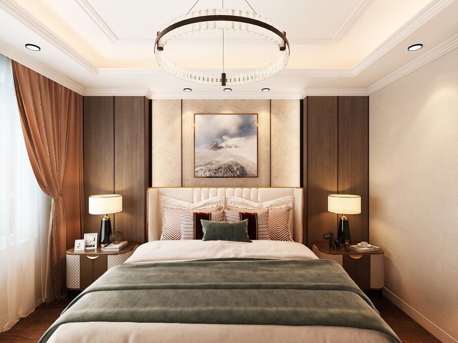 隐形门是木饰面背景墙的延伸,左右对称,视觉对称统一。房门+木饰面组合,设计成隐形门,空间显得更加舒适自然。