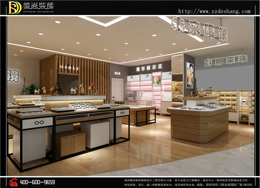 郑州德尚装饰10年专业致力于眼镜店装修和眼镜展柜制作、定制。是一家专业致力于眼镜店、视光中心、眼科医院等眼镜商业空间一体化装修、设计、施工和眼镜商业柜台、道具制作的企业。公司以郑州为服务管理中心,网络遍布全国,拥有一批创造力,凝聚力,独到设计理念的设计师团队和经验丰富的工程施工队伍。