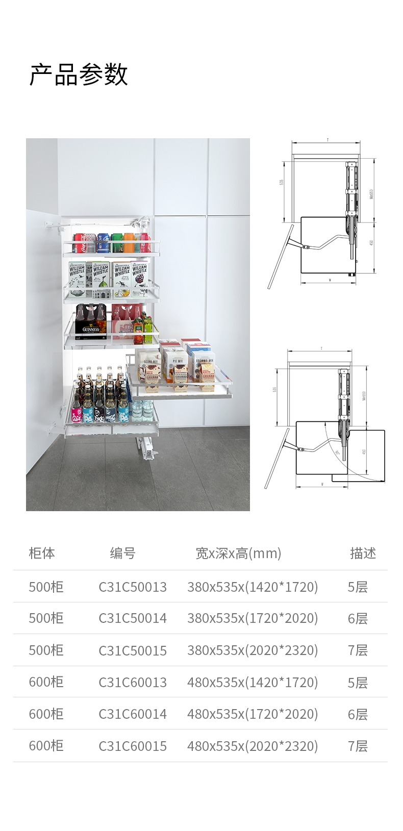 篮体旋转、结构新颖、简单,能够实现门板连动全展架体,其单层篮子可上下调节并能够实现独立篮子旋转90°,从而做到层与层之间的错层,达到取物放物便捷,使用舒适,合理利用有效空间。