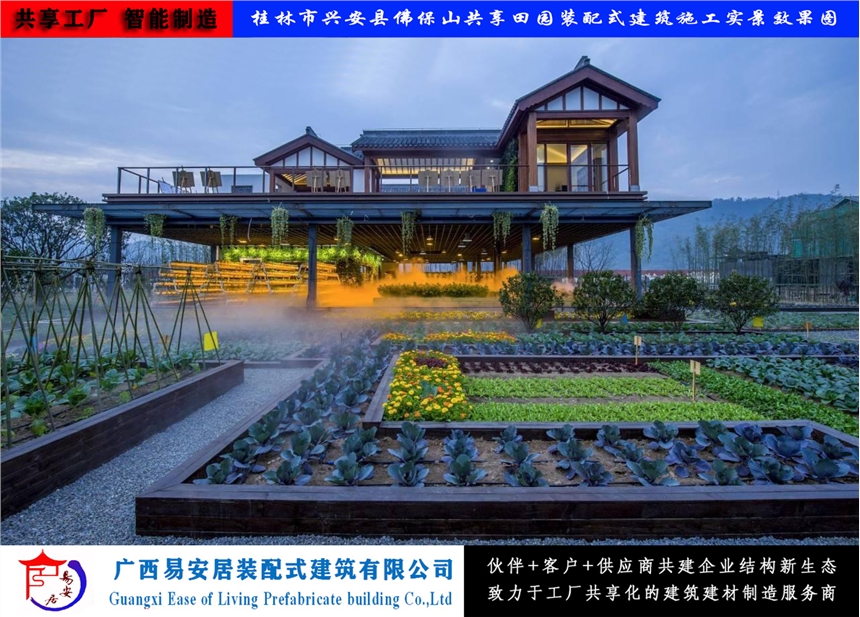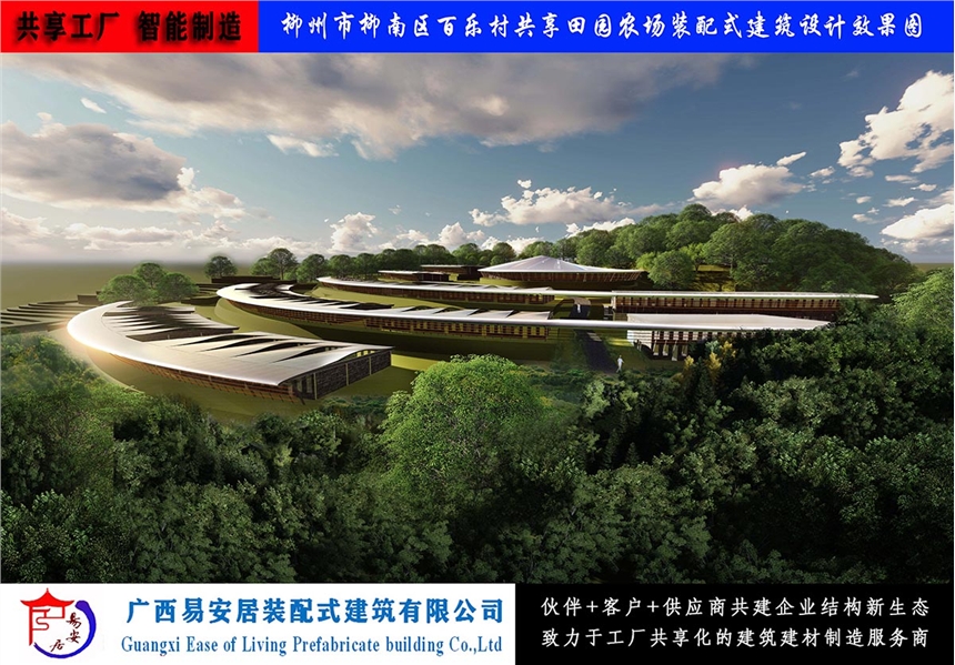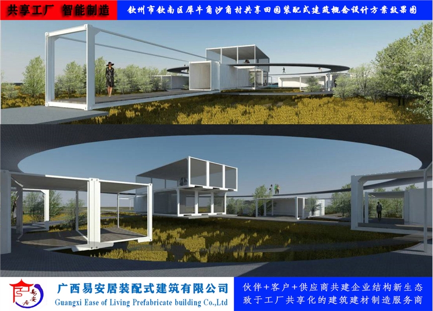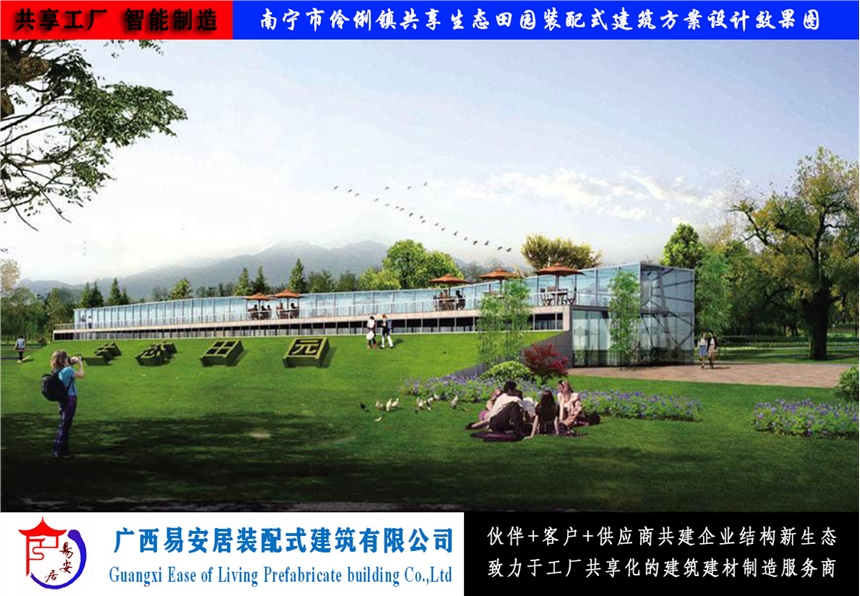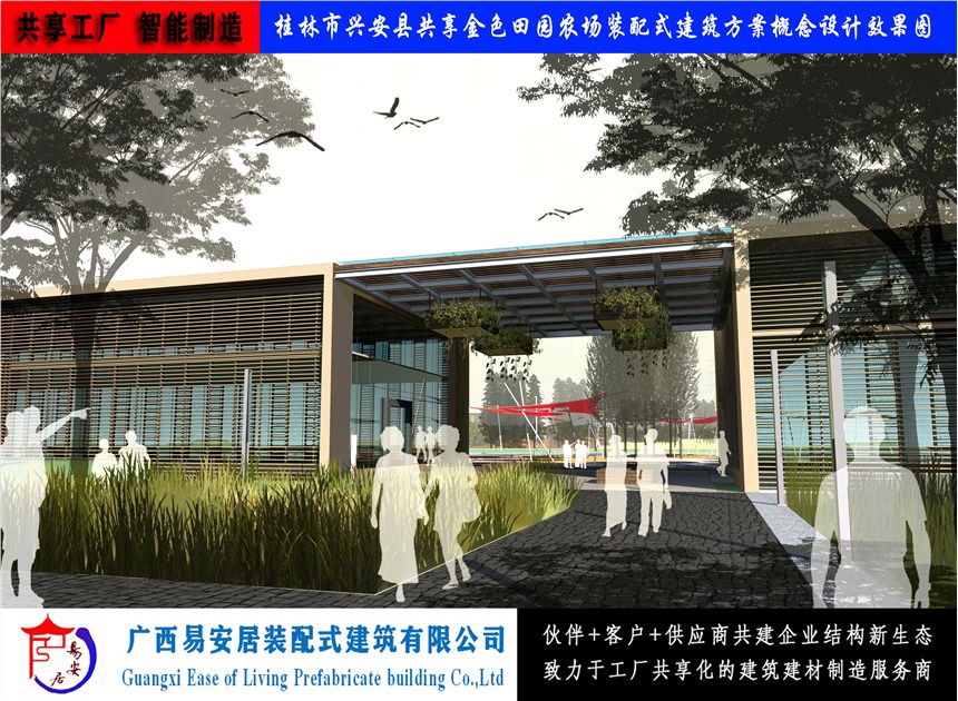 广西易安居装配式建筑有限公司以科学的规划、设计、修建为手段,再以现代化创新移动式装配式建筑为载体,把共享田园及共享农场与体现传统农庄风貌充分的结合起来,与农业系统、生态系统、人文景观系统的和谐统一。使之形成一个集生态旅游观光、现代高效农业、优化生态环境和社会文化功能为一体的原生态农业旅游、休闲新型共享田园及农场。