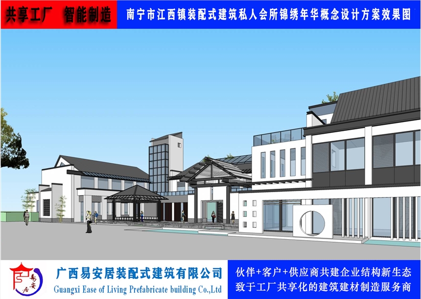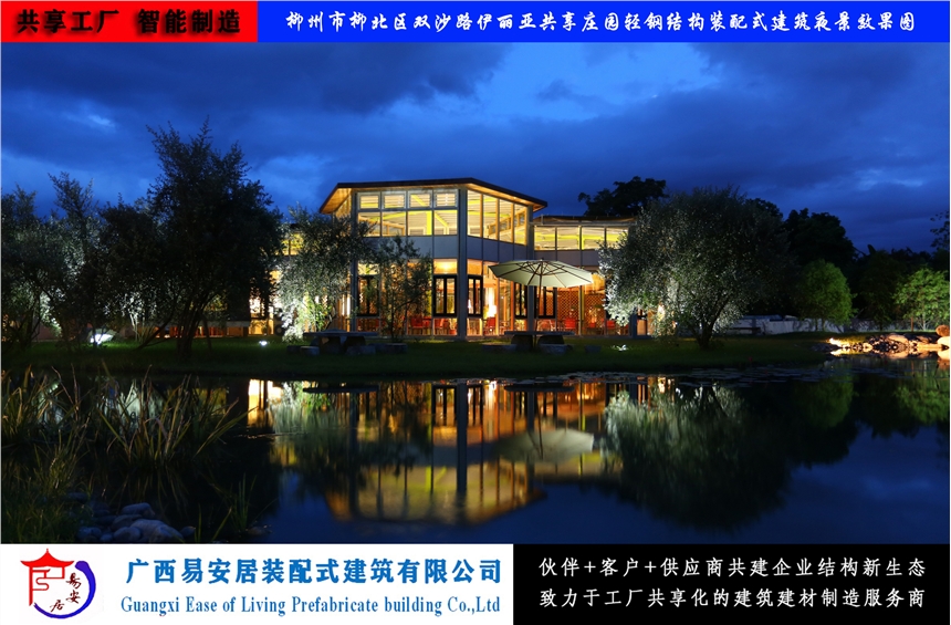 广西易安居装配式建筑有限公司以科学的规划、设计、修建为手段,再以现代化创新移动式装配式建筑为载体,意在为参与者提供一种自在、自然、幽静、野趣、新奇的新型私人游乐空间,使之形成一个集生态旅游观光和社会活动功能为一体的旅游、休闲新型共享庄园及会馆。公司装配式建筑是工厂化制造的产品,以构建预制化生产、装配式施工为生产制种造模式,以设计标准化、构件模块化、施工机械化为特征,能够整合设计、生产、施工等整个产业链,实现建筑产品节能、环保、全生命周期价值。公司产品循环利用、运输方便、移动自由、拆装灵合、稳定牢固、抗风抗震、防水防火、防潮防腐,使用寿命可达30年以上。重量轻能够满足共享农庄个性化、风格化的需要,将C2B个性化定制带入到切实可行的操作层面。
