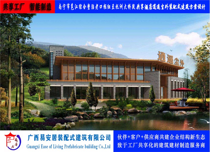 广西易安居设计制造并投资共享的民宿酒店及农庄突出“安、居、乐、业”四字方针,将闲置农村土地和环境资源充分利用起来,通过现代模块化装配式建筑组合,形成一房一院一地一情一民宿,并结合实际情况打造生活驿站、度假养生、文化创意的产业新链条,形成“民宿+农地+农庄”时代旅游的心灵港湾。产品进入了健康化、标准化、智能化、规范化的动作通道。装配式建筑风格多样化,可描绘出天空明净,阳光温暖,空气中弥漫着成熟的秋果的气息。可自然而然地进入“闲花落树鸣秋蒲,晚稻含香入暮年”怡然自得的心境;也可体验到“园林夕照明丹柿,篱落初寒蔓碧花”的景致。