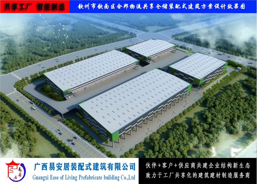 广西易安居装配式建筑有限公司以客户订单合同价格20%作为共享投资资金,投资并共享客户们的共享仓储仓库,致力于与伙伴、客户、供应商共建企业结构新生态。公司秉承智能制造、绿色装配的理念,研发设计和生产制造采用和推行模块化、一体化、标准化体系。现代仓储物流仓库实现了营销渠道互联网化、服务功能供应链化,由单一服务向一体化、综合化物流服务转变,实现了仓储资源的共享化利用,构建起仓储互联网平台数据库,实现仓储资源的网上信息发布及共享和调度、实时跟踪与监控。