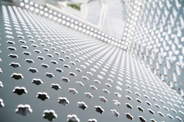 孔径:控制穿孔的孔径、孔间距和排列方式,可以调整视觉清晰度及视觉形象,结合穿孔率、板厚等因素可起到减少太阳辐射热,降低能耗的作用。穿孔铝板单元固定孔径可创造均质的视觉效果,变化处理孔径,则可以形成渐变或者图案效果。