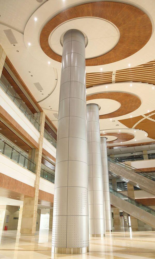 方型无缝包柱的应用为大型装饰空间提供了一个整体简洁的视觉空间;尤其是变幻莫测的建筑设计中,平整反而成了视觉另一缓冲点,常常给人们带来平凡的享受!