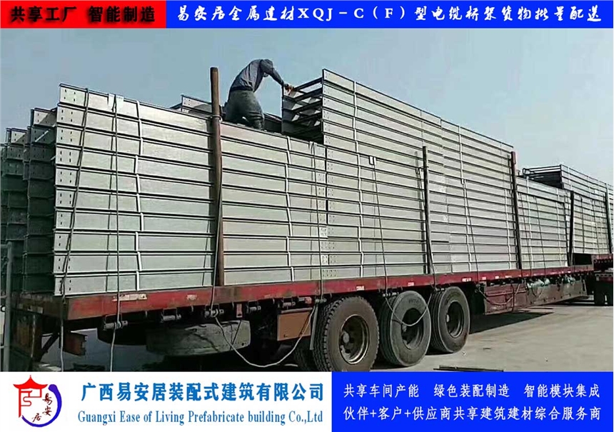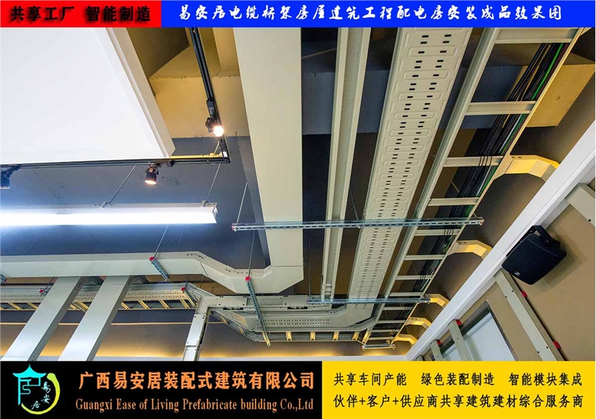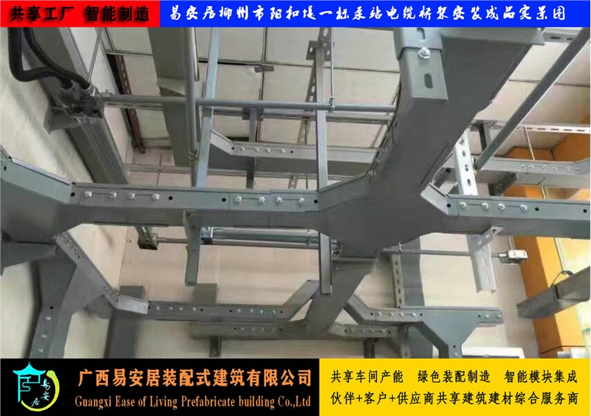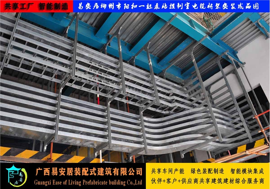 广西易安居装配式建筑有限公司生产的电缆桥架各项技术指标均符合产品质量监督检验中心的相关技术要求,且有钢制、玻璃钢和铝合金材质,产品部品部件有直通、45度水平弯头、90度水平弯头、水平三通、水平四通、垂直上弯头、垂直下弯头、上垂直三通、上边垂直三通等,规格型号齐全,产品适用于高速公路,铁路,隧道,电力,石油,化工,市政桥梁等工程建设。