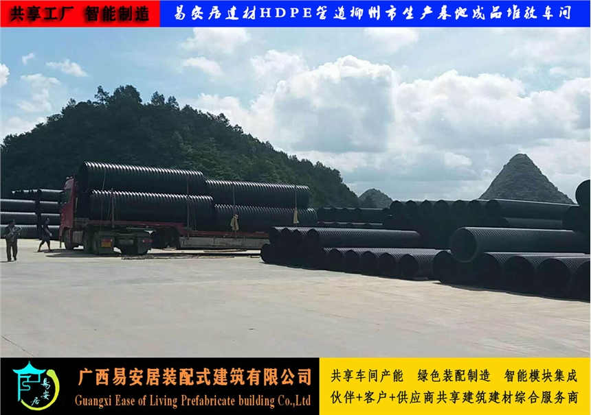 易安居柳州工厂生产的HDPE管具有接口稳定、重量轻、摩阻小、抗冲击、抗开裂、耐老化、耐腐蚀、挠性好、耐磨性能好、柔韧性好、抗震性能强、运输安装方便等特点。