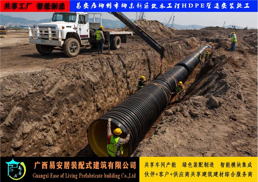 广西易安居装配式建筑有限公司还可提供HDPE管道安装配套服务,采用电热熔带或热收缩带连接技术,施工快捷,连接质量高,接头强度大,使得接口材质、结构与管体本身的统一性。在施工中,不需混凝土垫层和混凝土管基沟槽合格后即可直接敷管,可做到边开挖、边下管、边回填,缩短工期,减少厂家和安装施工不协调性。