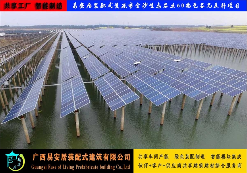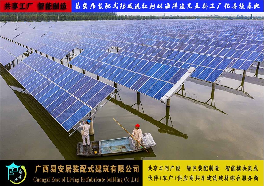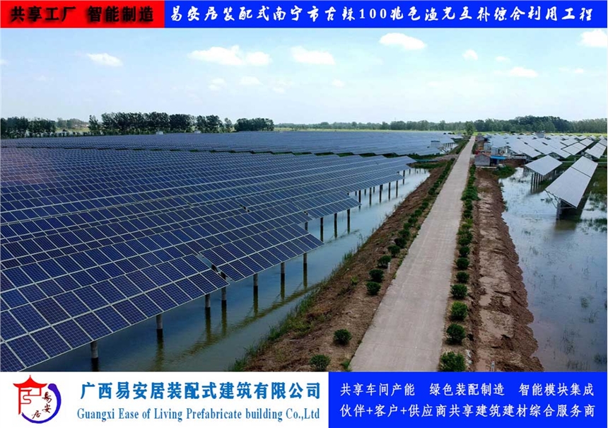 广西易安居装配式建筑有限公司是较早开展渔光互补3P项目的企业之一。公司生产制造的PHC预应力混凝土管桩和钢结构光伏支架,是装配式BIPV渔光互补项目建设的主要材料和构件。公司设计制造渔光互补项目在鱼塘上架设了太阳能电池板,减少了光照,每亩装机容量可达40千瓦。并形成了遮阴效果,对喜光鱼类影响较大,因而更适宜于不喜光的特色鱼类养殖。并能形成较好的日照、通风、降温环境,对延长光伏发电组件寿命、提高发电效率较为有利。