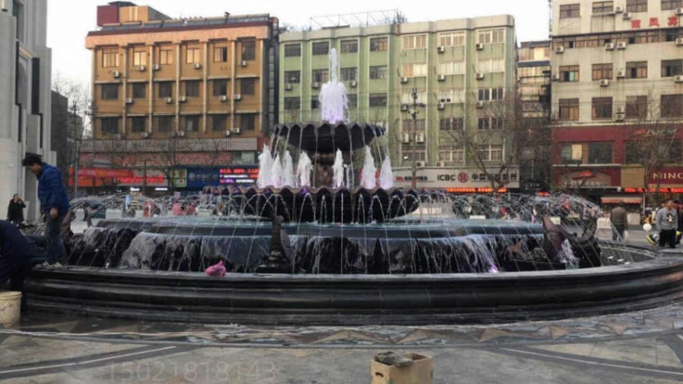 这款喷泉雕塑位于南宁北广场,双层主体都是由黄铜打造,上下盘边为波浪形,喷泉流水是非常好看,盘壁和盘底镌刻古代云纹、将复古于潮流相结合,四周还有一条条活灵活现的鲤鱼作为装饰,整体效果很是好看。适合公园、广场、小区、别墅摆放。