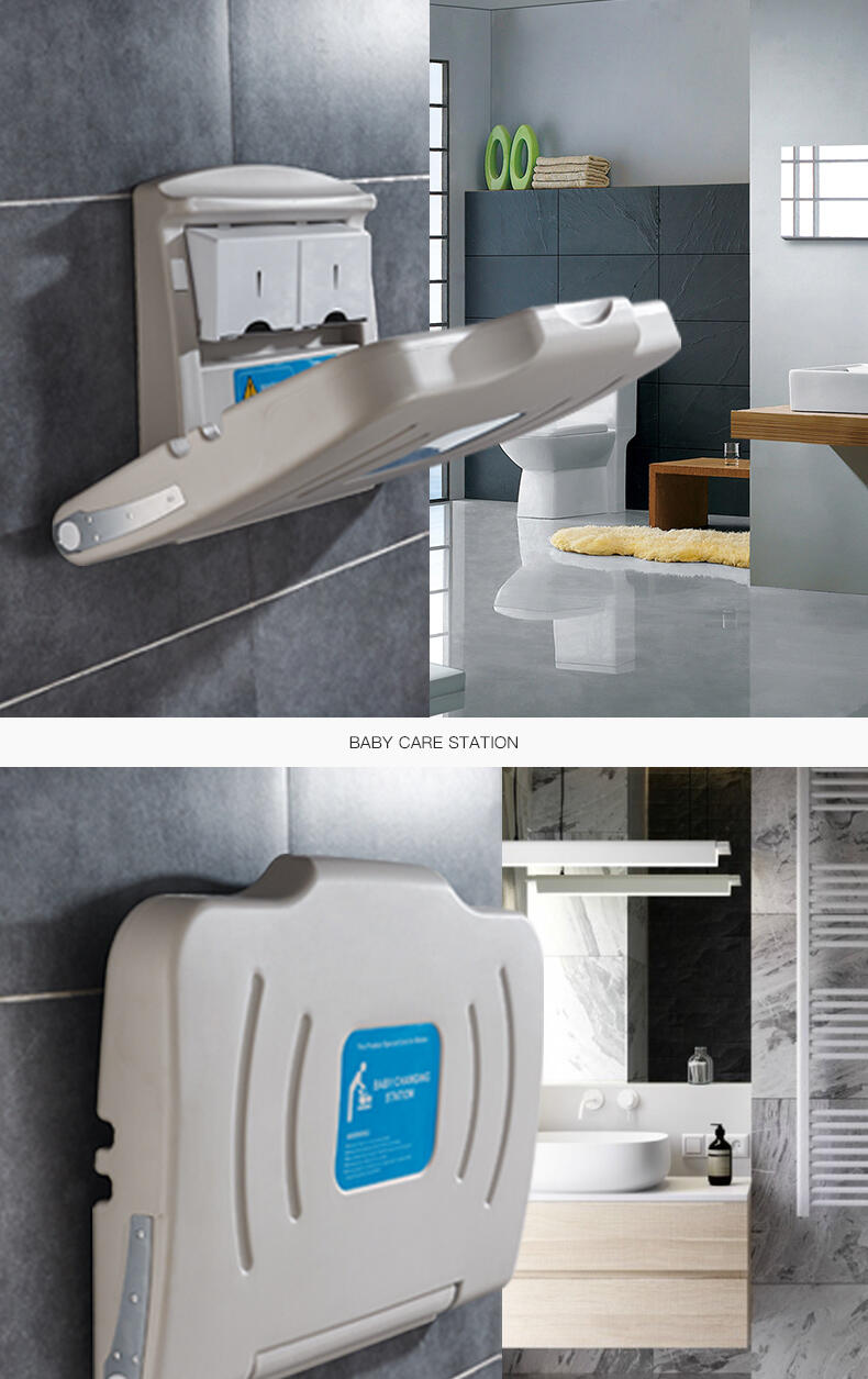 用于公共场所:商场、火车站、公共洗手间、机场、火车、飞机等地方的人性化产品,解决了婴儿出门没地方换尿布的困惑和麻烦,更为带婴儿的父母提供便捷安全的婴儿换尿布平台。 平滑流物的合页系统及不可视的轴杆设计能更好地保护宝宝,降低宝宝皮肤被夹的危险;角板支持装置增强此台的力量和稳定 婴儿护理台主要是在公共场所装置的便捷设备,又叫婴儿打理台,婴儿换尿布台,婴儿尿布台等。它可以提供父母和宝宝温馨的服务,在顾客需要给孩子整理衣服、换尿布时,可将婴儿平放在整理台上面,方便母亲为宝宝换尿。婴儿整理台采用抗霉、抗菌之高品质材质一体成型,特殊圆角设计,安全可靠。台面宽大,配有可调整的安全带,既方便了带婴儿出游的妈妈,也让环境卫生有了基本保证条件。在发达国家,婴儿护理台已经成为公共卫生间的标配产品,随着国内卫生间设计的逐步完善,婴儿护理台也将被越来越多使用者接受并采纳。