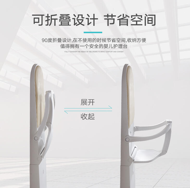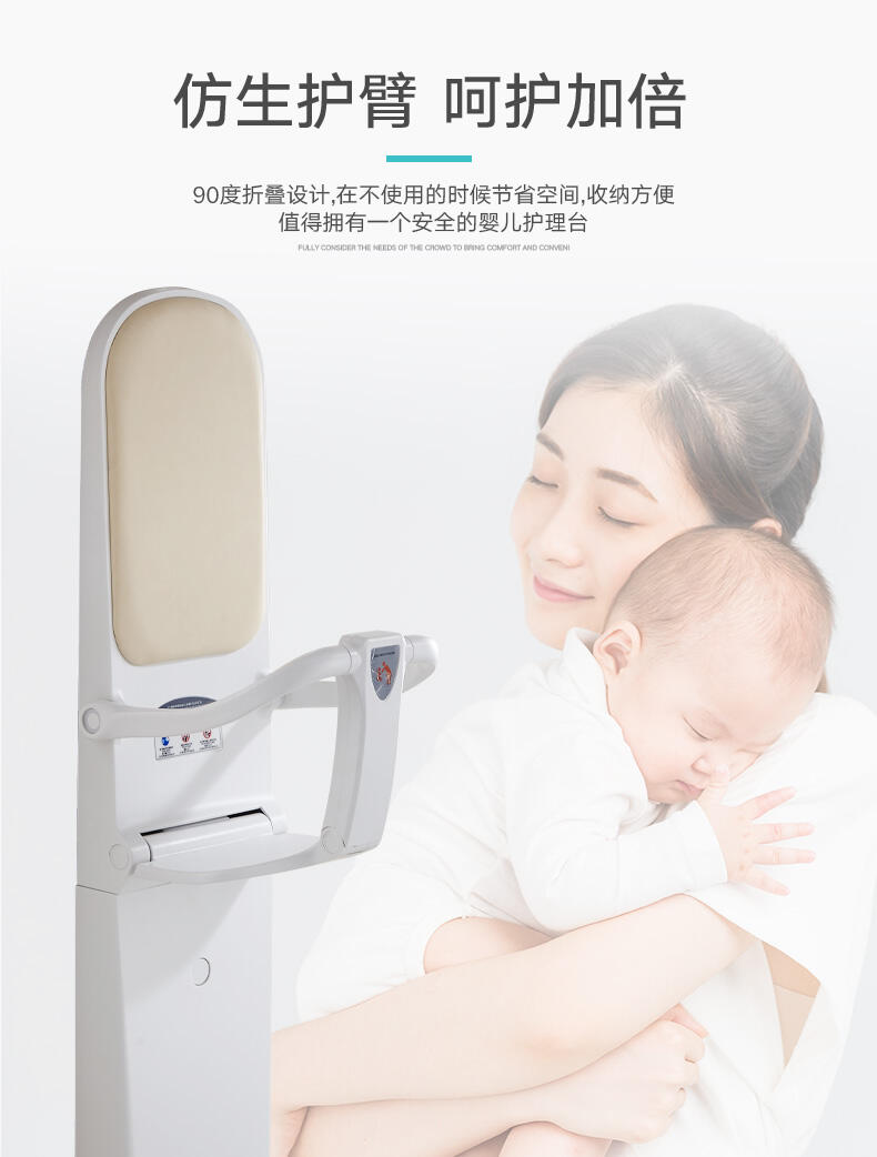 用于公共场所:商场、火车站、公共洗手间、机场、火车、飞机等地方的人性化产品,解决了婴儿出门没地方换尿布的困惑和麻烦,更为带婴儿的父母提供便捷安全的婴儿换尿布平台。 平滑流物的合页系统及不可视的轴杆设计能更好地保护宝宝,降低宝宝皮肤被夹的危险;角板支持装置增强此台的力量和稳定 婴儿护理台主要是在公共场所装置的便捷设备,又叫婴儿打理台,婴儿换尿布台,婴儿尿布台等。它可以提供父母和宝宝温馨的服务,在顾客需要给孩子整理衣服、换尿布时,可将婴儿平放在整理台上面,方便母亲为宝宝换尿。婴儿整理台采用抗霉、抗菌之高品质材质一体成型,特殊圆角设计,安全可靠。台面宽大,配有可调整的安全带,既方便了带婴儿出游的妈妈,也让环境卫生有了基本保证条件。在发达国家,婴儿护理台已经成为公共卫生间的标配产品,随着国内卫生间设计的逐步完善,婴儿护理台也将被越来越多使用者接受并采纳。