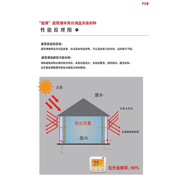 “科贝尔”系列材料的调温机制与原理。本系列微晶粉产品是一种能降低冷热传导系数的新型功能材料,是一种由纳米级真空微珠颗粒组成的水溶性微晶。材料,可有效阻止或减少外界冷热环境温度在辐射、对流、传导过程中对室内小环境温度的影响,可分解75%以上冷热环境温度对室内温度的影响,有效提高或降低建筑物内温度5--25℃,高达90%以上的发射率能迅速散失层面聚集的热量保持层面阴凉,可节省制冷热电量70%,显著的降低了建筑材料成本和提高室内恒温效果,以实现室内温度冬暖夏凉、空气清新、体感舒适的效果。