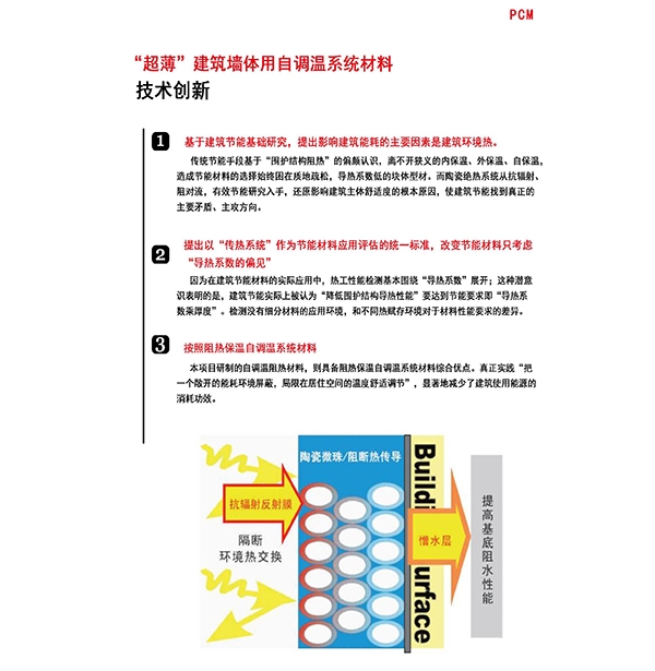 石家庄邦迪高分子材料有限公司研发生产的,“科贝尔”建筑墙体用超薄自调温系统材料,精选多种非金属矿物质和进口材料组成白色纳米微晶粉料,融合国际无机粘接、固化和改性技术,经先进工艺配制成多种不同的自调温、保温隔热系统材料。这些材料均具有环保型、节能性、水溶性、阻燃防水性的特点,可从源头上有效“切断”大自然冷、热环境对于建筑物内小环境温度的影响。是一种能阻止建筑冷热传导的新型功能材料。在建筑物外围薄薄的喷涂2-33毫米厚,就能达到理想的保温阻热效果,为传统建筑脱去包裹在建筑围护结构上厚重的“棉袄”,穿上轻便超薄的保暖“内衣”,消除了建筑安全隐患,既方便施工又缩短工期;既大幅度降低建筑物的材料成本,又可有效调节室内小环境的温度。