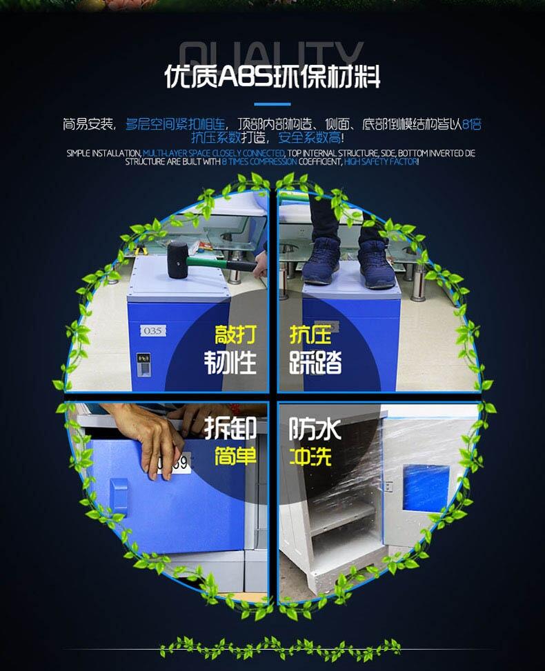 1材?? 质:更衣柜为ABS全新工程塑料制成,强度高、韧性好、耐冲击,不易腐蚀、,无毒无味,环保耐用。