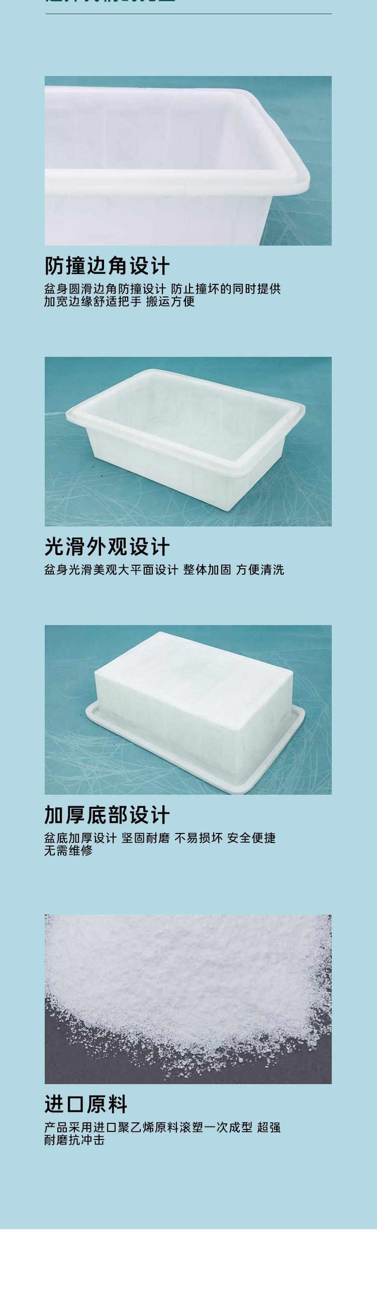 产品描述,滚塑周转方箱,俗称牛筋桶。采用韩国乐天公司制造的食品级聚乙烯原料,滚塑一体成型,  原料;进口食品级低密度聚乙烯塑胶原料  特点,具有耐酸碱,耐高温(80)耐冷冻(-40),无毒卫生,安装运输便捷,无需维修,坚固耐腐蚀,耐震耐撞击,防紫外线不易衰老等特点  用途管饭用于五金,电子,工具,零件业的存放,中转,酸洗;制衣,鞋帽,纺织,印染业中漂,洗,染;医药,食品,蔬菜业中储蓄,转运,冷冻冷藏;环保卫生等配套设施滚塑成型,韧性好,品质如牛筋一样,广泛应用于水产业、养殖业、纺织印染、漂洗酸洗等行业。  一、K100L上边方盆参数  1.       产品尺寸:上外径940*610mm、下外径830*490mm、高250mm、边宽35mm。  2.       产品重量:4kg。  3.       制作工艺:滚塑一次成型。  4.       产品原料:低密度聚乙烯LLDPE。  5.       适用范围:五金电子、水产养殖、存放周转、酸洗制衣、鞋帽纺织、漂染印染、医药食品、蔬菜业等。  产品特性:  1.       耐酸碱、耐碰撞、耐高温80度、低温-40度、环保卫生、安装方便、无需维修。  2.       光滑美观易清洗。  3.       边角人性化延伸设计方便搬运,边角加厚设计承载能力强,桶底加厚设计,增加强度及韧性。  4.       防紫外线,耐腐蚀性强,无死角,寿命长。