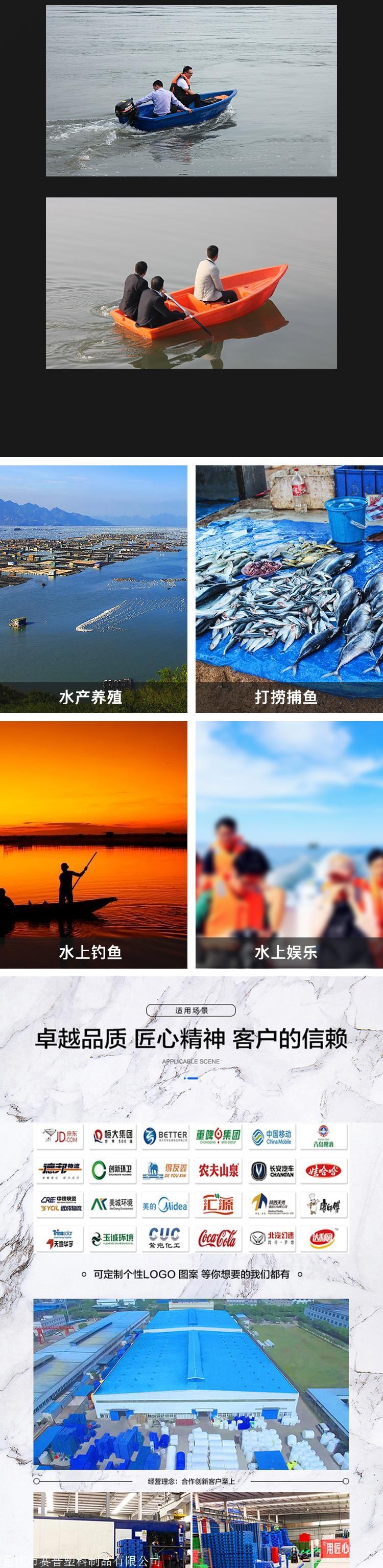 塑料渔船产品优势:  一,采用国内先进的滚塑技术,产品一次成型,船体为双层机构制造,更加牢固。 二,耐各种水质侵蚀,如海水污水,表面光滑,使用后清水一冲就干净,船体轻巧,不易碰伤人的身体,安全可靠,靠电动马达行使轻松省电。 三,塑料制品船体轻,移动方便,二人能轻松抬起。 四,可以安装电动马达,行使时无声音,不易惊动鱼类。 五,船体表面采用防滑设计,不过提醒广大亲们在船上行走时注意安全。