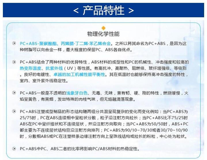 2.PC ABS结合了两种材料的优异特性,ABS材料的成型性和PC的机械性、冲击强度和较高的热变形温度、抗紫外线(UV)等性质。含有高抗冲、高耐热、阻燃级、玻纤增强级等级别良好的电镀性、卓越的加工机械性能平衡性。其在低温也能够保持高冲击强度的特性,室内、室外紫外线稳定性。