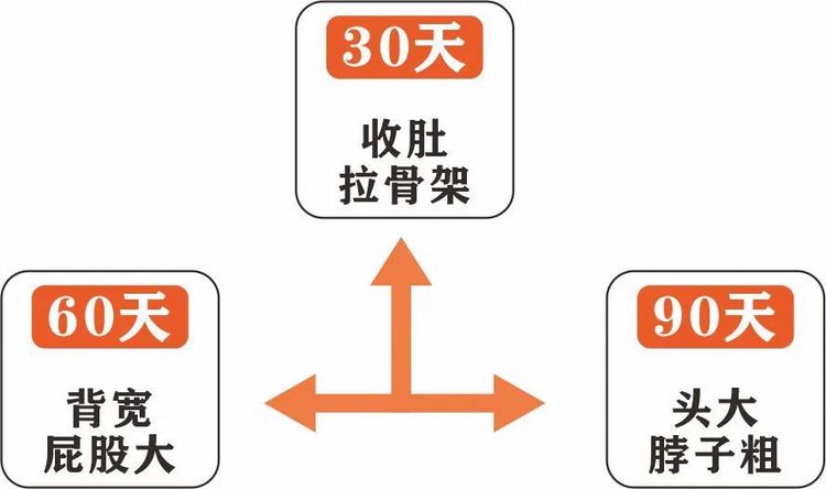 1、30天收肚子、60天屁沟大,90天头大脖子粗;