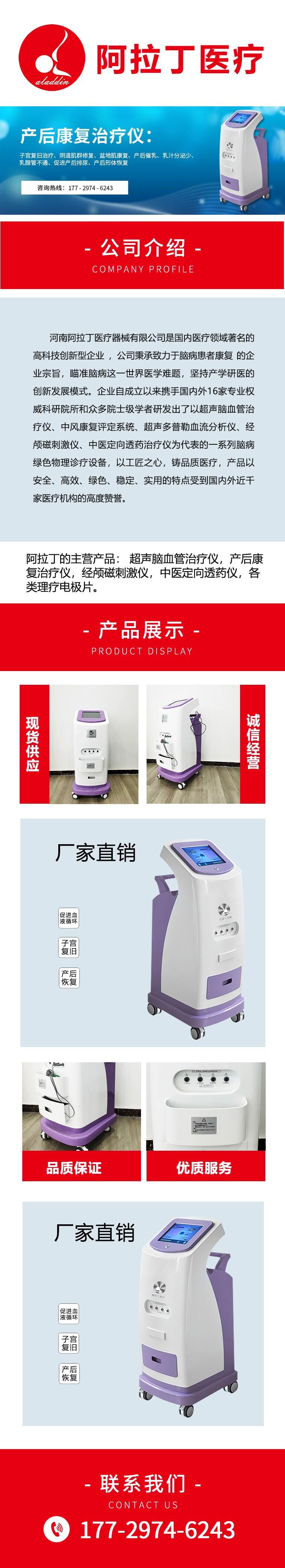产后康复治疗仪适用于:产妇催乳常规治疗,乳汁分泌少,乳腺管不通,促进产后排尿,子宫复旧治疗,产后恢复的临床治疗。