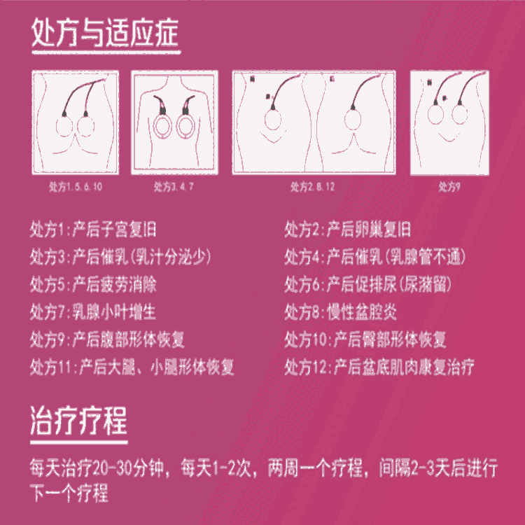 产后康复治疗仪是运用现代科技手段,将产后康复治疗纳入科学化、规范化和标准化的轨道,为孕妇提供产前产后服务,积极帮助产妇限度使身体恢复到产前状态,是促进产妇产后康复,提高产妇生活质量,促进妇女产后形体恢复,提高母乳喂养水平的重要措施。产后康复是一项新兴的产后恢复治疗技术。它是根据妇女产后身体变化,运用现代科技手段,针对妇女产后乳房、卵巢、子宫、盆底、阴道、形体等变化进行而主动的健康恢复治疗。威森波产后康复仪可改善血液循环,减轻膀胱水肿,促进膀胱肌恢复功能,改善产后局部肌肉酸痛,缓解疲劳,对恢复体力有一定作用。适用于妇产科进行催乳常规治疗、乳汁分泌少、乳腺管不通、促进产后排尿、子宫复旧治疗、产后恢复等。产后康复治疗仪能兴奋、抑制和神经传导、肌肉收缩和神经兴奋与肌肉收缩的耦联都是以电活动为基础。电刺激是指用特定参数的脉冲电流,刺激组织器官或支配它们的中II枢神经或外周神经,从而引起组织器官的功能发生改变。电刺激治疗于1958年由Caldwell首先提出,而应用于临床则始于20世纪70年代中期。