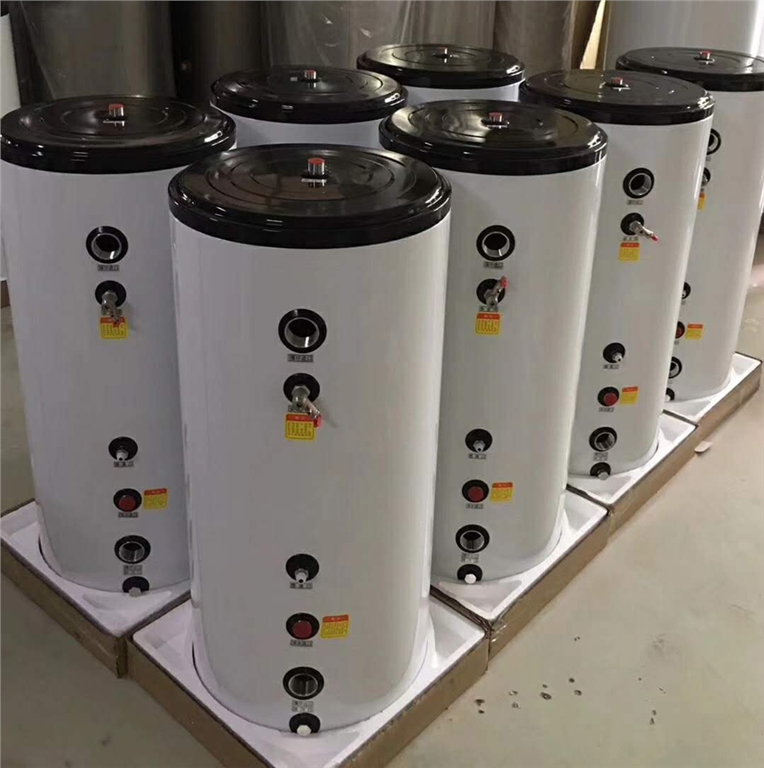 缓冲水箱的口径根据系统功率、水流量及总水容量来确定进回水口径的大小,一般情况下进回水口径为DN40和DN50;这么大管径安装过程中会产生很大的安装扭力,一般的不锈钢材料(厚度一般在0.8~1.2mm)的缓冲水箱在大扭力安装情况下很难承受,不锈钢内胆容易应大扭力作用管接口焊接部位产生变形;而搪瓷缓冲水箱因内胆材料(BTC340R专用搪瓷钢板,厚度达到在1.8~3.5mm)和搪瓷工艺的优越特性,不会产生因安装扭力过大而导致的内胆损伤,安装过程中的安全和品质有绝对保障。缓冲水箱起到保护主机的作用,能有效解决系统过小所带来的负荷波动和主机频繁启动问题,主要延长主机的启动时间,减少主机的起停次数,保护主机的寿命,达到节能的目标(排污,排气) 节能水箱主要包括:节能缓冲水箱与储能热水水箱。节能缓冲水箱是应用在暖通空调水系统中,增大小型系统的水容量,储存冷热源。从而减少主机的启停次数,达到节能省电的目的。储能热水水箱是多种热源,满足在一种热源不能加热时,可以采用其他辅助加热系统,使水箱实现全年全天侯使用。即时即用。 节能水箱的组件 1)节能缓冲水箱 1,内胆:主要功能:盛水保温的作用 2,保温层:主要功能:保温的作用 3,外壳:主要功能:起到外部保护的作用,防止内部的损毁的作用 4,温压一体表:主要功能:观看和检测内部水源的压力和温度是否正常 5,电加热:主要功能:起到辅助加热的作用 6,温控器:主要功能:控制其内部水的温度 7,排污阀:主要功能:可定期排除水箱内的污水 8,漏电保护插头:主要功能:起到漏电保护的作用 9:安全阀:主要功能:保障水箱内部在一个稳定的压力内正常运行 节能缓冲水箱的优势 .保护主机,节省电能。增加系统水容量,减少主机启停次数,延长主机寿命,节省电能 保温效果好,24小时温差3摄氏度 结构设计合理,采用上进下出的方式,自动排气,大大减小了调试时的难度,同时也防止了水泵的气蚀 彻底排污,检测直观。排污阀在内胆低端可彻底排污,压力温度一体表可直观检测水温与压力。 我能源接入,可用太阳能,锅炉等热源 优化设计,热水出水管路在内胆顶部更大限度的利用资源 当热源条件达不到设定温度,辅助电加热会自动加热。