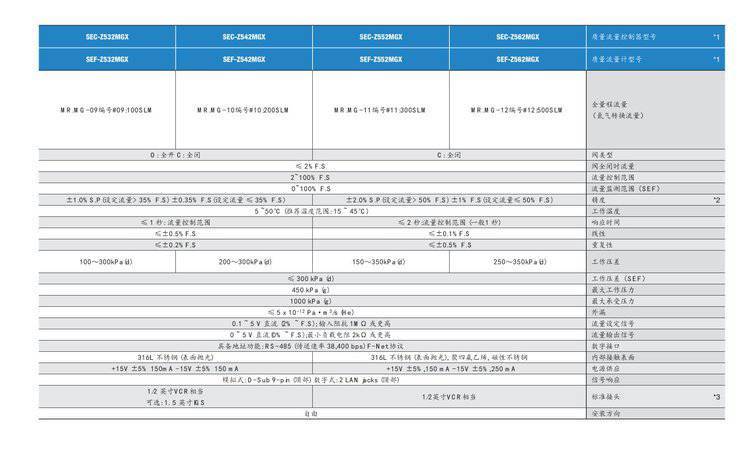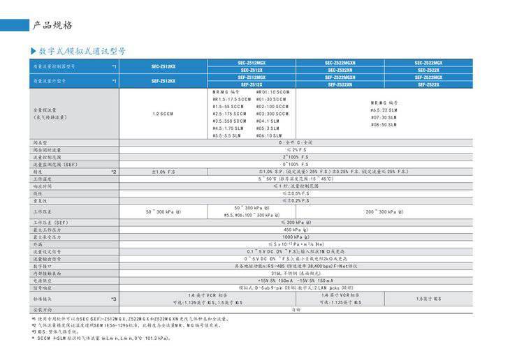 型号*1SEC-Z512、Z514SEC-Z512MGXSEC-Z522MGXNSEC-Z522MGXSEC-Z514MGXSEC-Z524MGXN SEC-Z524MGX全标准流量(N2 转换流量)1/2SCCM10SCCM-10SLPM10-50SLM阀门类型O: 通常打开 C: 通常关闭完全关闭控制阀时的流量≤ 2 F.S.流量测量范围0- of F.S 性*2±1.0F.S.±1.0S.P.(流量>25F.S.)±0.25F.S.(流量≤25F.S.)工作温度5 -50°C (建议温度范围: 15 -45°C)响应≤ 1 秒:超过全流量范围直线性≤ ±0.5 F.S.反复性≤ ±0.2 F.S.工作压差值≤ 300 kPa (d)zui大工作压力450 kPa (g)耐压1000 kPa (g)外部泄漏率≤ 5 x 10-12 Pa·m3/s (He)流量设定信号0.1 - 5 V DC (2 - F.S.); 输入阻抗 1 MΩ 或更高流量输出信号0 -5 V DC (0 - F.S.); zui小负荷阻力 2 kΩ 或更高数字界面地址功能: RS-485 (转换速度 38,400 bps)F-Net 协议,DevceNet接液部材质316L 不锈钢(表面抛光)电源 15V±5 150mA-15V±5 150mA信号反应模拟: D-Sub 9-pin (TOP)数字: 2 LAN jacks (TOP)标准接头*31/4 inch VCR1/4 inch VCR1.5 inch IGS选择: 1.125 inch IGS, 1.5 inch IGS可选1.125 inch IGS安装方向自由 ? |
