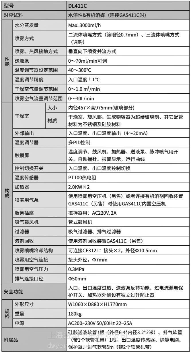·?采用 的双流体喷嘴喷雾方式和大型干燥室,比起其它的产品,DL411C干燥室的样品附着量少,干燥室上设计有特 殊的冷风入口,能有效防止喷雾粒子向上回流飞舞和附着。