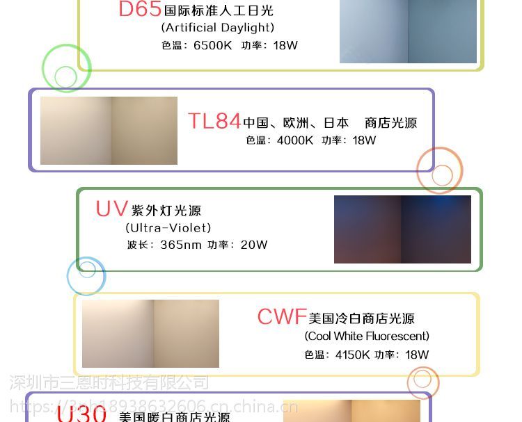 规格 | D65、TL84/U30、CWF、UV、A | ||