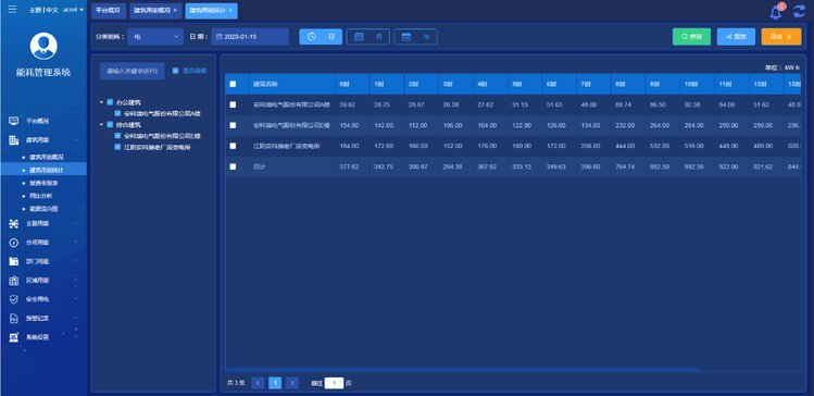 统计当前账号下所有建筑日、月、年用能统计报表,可选择以报表或者图表方式显示,可导出excel表格形式保存。