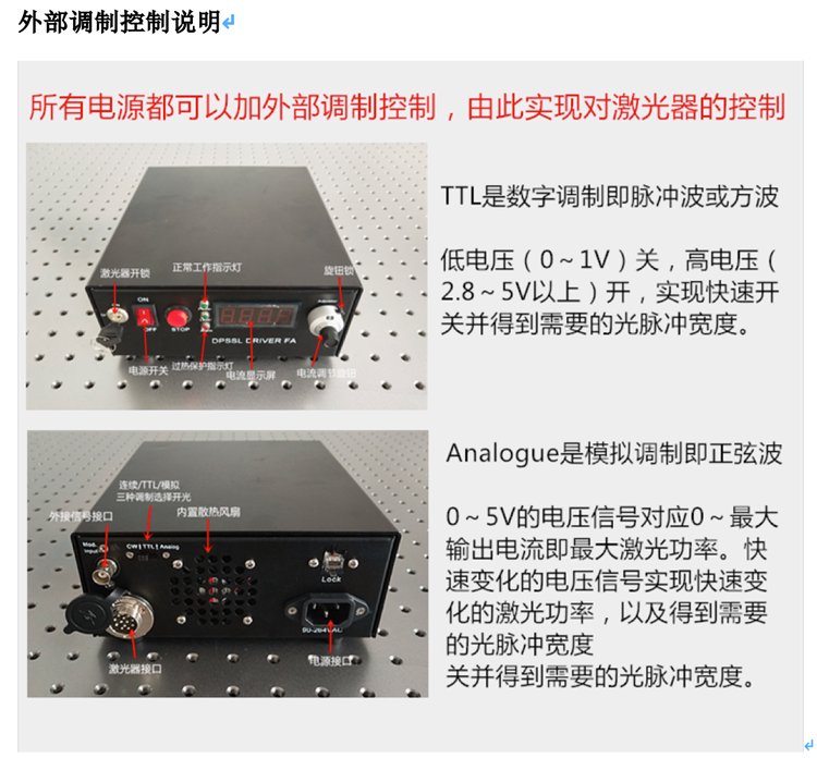 Longlife operationAnalog/TTL modulationCollimated straight beamHigh efficiencyHigh reliability