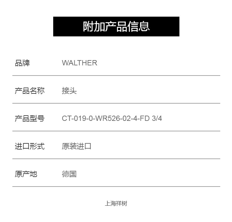 商品核心词 | WALTHER 原装进口 接头CT-019-0-WR526-02-4-FD 3/4 | ||