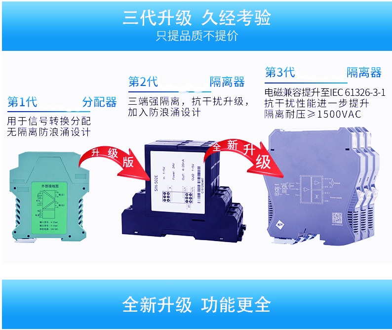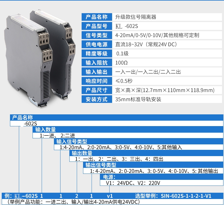 MIK-602S系列信号隔离器,给现场的变送器提供隔离的工作电源,同时检测回路中的电流/电压信号,经过变换,输出隔离的电流/电压信号,实现了输入、输出、电源之间的三端隔离。