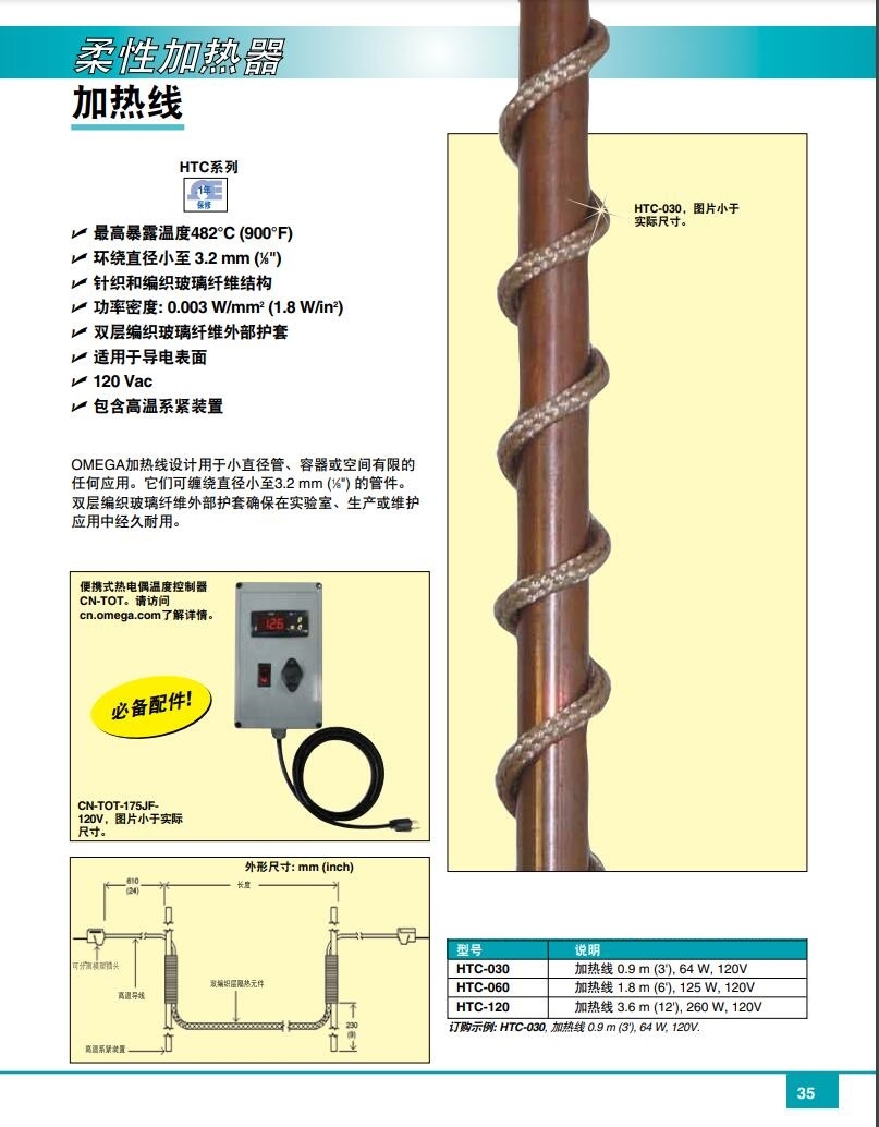 OMEGA加热线设计用于小直径管、容器或空间有限的任何应用。它们可缠绕直径小至3.2 mm (?") 的管件。 双层编织玻璃纤维外部护套确保在实验室、生产或维护应用中经久耐用。