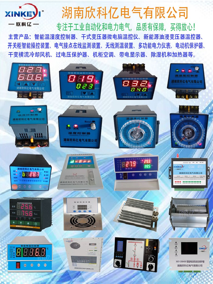 多功能电力仪表、开关柜智能操控装置、温湿度控制器、电动机保护器、电气接点在线监测装置、干式变压器电脑温控仪、新能源油浸变压器温控器、干变横流冷却风机、过电压保护器、户内高电压带电显示器、除湿机和加热器等。