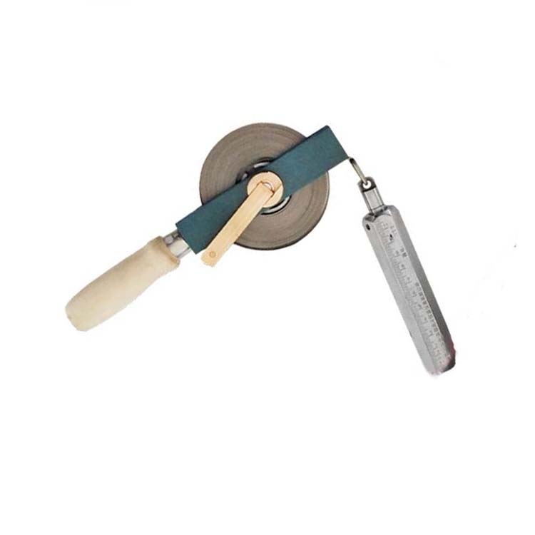 摇柄采用单向棘轮式离合结构,可令量油尺靠尺砣的重量自动下落,支架为折叠式金属支架,下端有卡槽,便于支撑量油尺和导去静电。
