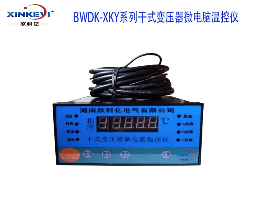 BWDK-XKY3K130干式变压器微电脑温控器(简称干变温控)是我公司为风冷干式电力变压器可靠运行而设计的新一代多功能型微电脑温控仪。利用预埋在干式电力变压器三相(或铁芯)绕组线包中的三只(四只)NTC铂热电阻来检测干式电力变压器线包的温升,并根据温升自动控制冷却风机的启停、超温报警直至超高温跳闸以保证干式电力变压器的安全运行。由于采用目前先进的RISC单片计算机并结合先进的I2C存储与调整技术,根据JB/T7631标准设计而成,使得温控器具有结构简单,运行可靠,抗干扰能力极强的特点。同时温控器还具有“黑匣子”功能,可记录停电时三或四个绕组包的温度及本机的工作状态。在抗干扰方面,本仪器在设计上优化了抗干扰措施,同时可运用软件实时监控温控器的工作状态。在使用方面,本仪器还具有操作简单、安装方便、维护容易的特点。