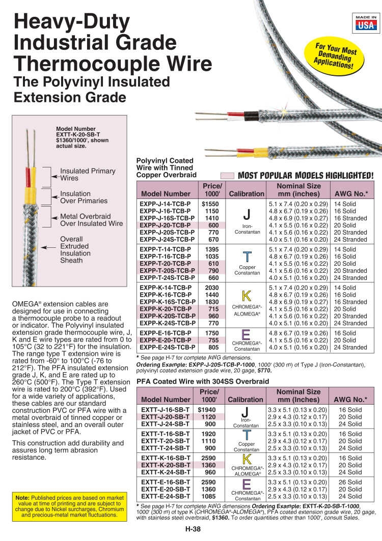 "OMEGA延长电缆设计用于将热电偶探头连接到读数器或指示器。J、K、E线类型由延长级热电偶线制成,绝缘层温度为0~105°C(32~22°F)。T型延长线的温度为-60°~100°C(-76~212°F)。这些电缆适于各种应用,每个线脚采用不同颜色的挤塑PVC或PFA制成。然后将相同材料的另一种颜色的护套挤塑套在两个线脚外。之后在绝缘导线上使用金属编织护套,即PVC导线覆有镀锡铜,PFA导线覆有不锈钢。该编织护套除了可在噪声环境中提供电气屏蔽外,还增加了导线的耐用性、灵活性和长期耐磨性。蕞后,在整体导线上挤塑第三层PVC或PFA,对金属编织护套进行保护。