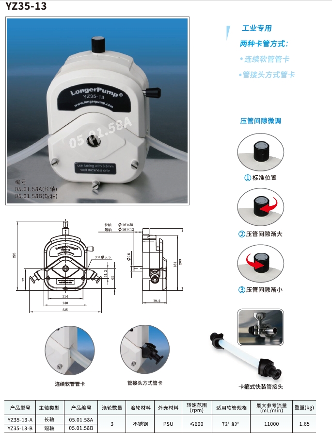工业快装型泵头KZ35与YZ35-13流量相当。采用全不锈钢材质,工业专用。有两种卡管方式:连续软管管卡和管接头方式管卡。KZ35主要零件采用304不锈钢材质,符合GMP标准要求,可以在制药、食品等有卫生等级要求的领域应用。泵头采用压块与泵体分离的结构,泵体外表面经过镜面抛光处理,既美观大方又便于清洁。KZ35泵头还具有流量范围大、运行稳定可靠、耐腐蚀等特点,同时根据用户需求,可实现双泵头串联使用。