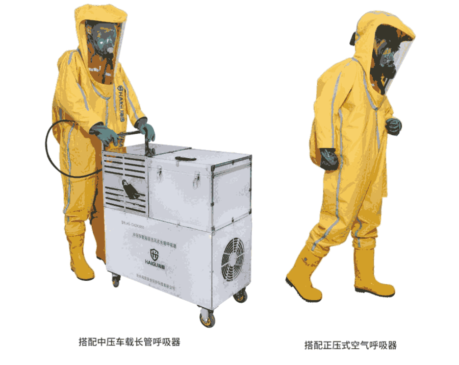 海固HG-3NF气密全封闭式三级重型防化服,呼吸装置内置,服装符合人体工程学设计,其结构有利于穿着者的安全与卫生,不影响人体正常生理要求,穿戴舒适;连体式,连头罩,连手套,连防化靴,肩部进入,耐腐蚀纯铜拉链加拉环,使整体效果达到高气密性;门襟保护,尼龙搭扣粘连,双重保护层,确保化学液体不渗透,实现全封闭式防护,防护效果更加全面。领口、袖口、裤脚紧密严实,防止酸碱侵入。手套、胶靴和服装连接牢固,袖口和裤腿处采用环组件连接,方便拆卸更换手套和防化靴。