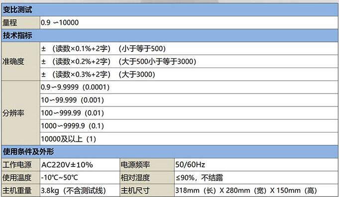 3. 量程宽、精度高,变比测量范围可达10000,且值为10000时测试精度保证0.3%。