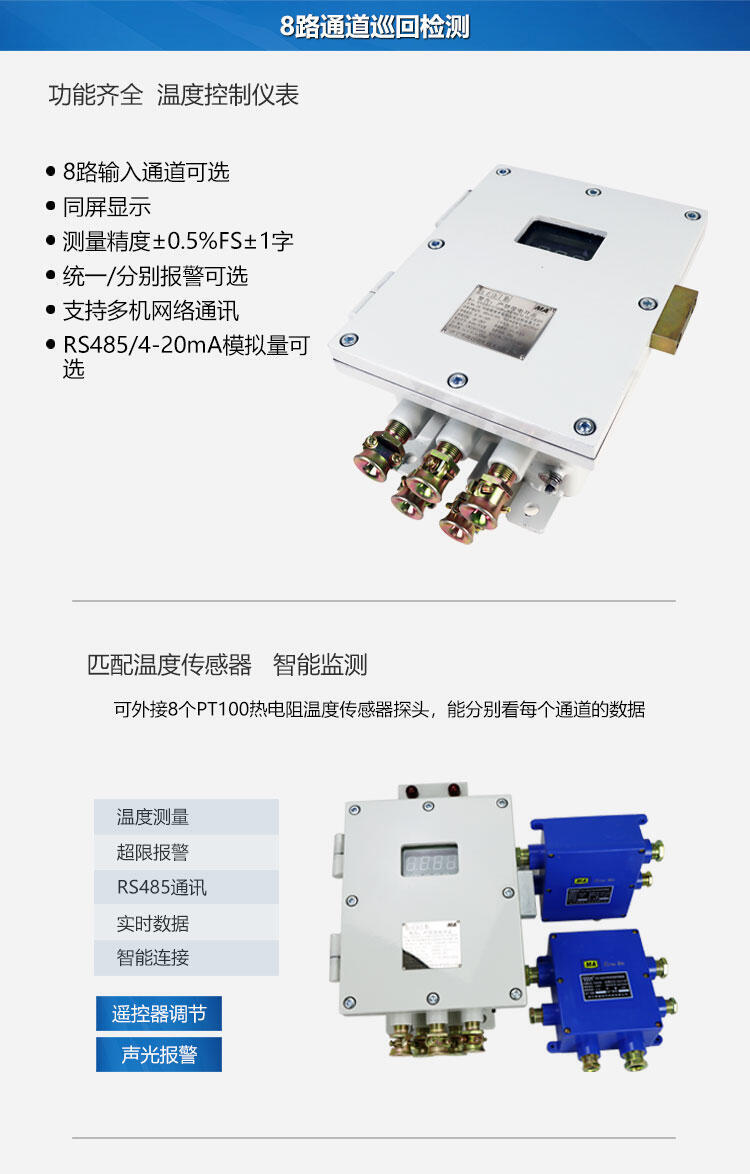 矿用隔爆兼本安型温度巡检仪温度巡检装置 PT100矿用温度传感器主机可接8路PT100(GWP200),根据PT100(GWP200)阻值测量出被测设备温度,具有就地显示功能,具有本安声光报警输出,温度高低限报警输出及RS485通讯功能,可并入集控系统,满足远程数字化管理需求。