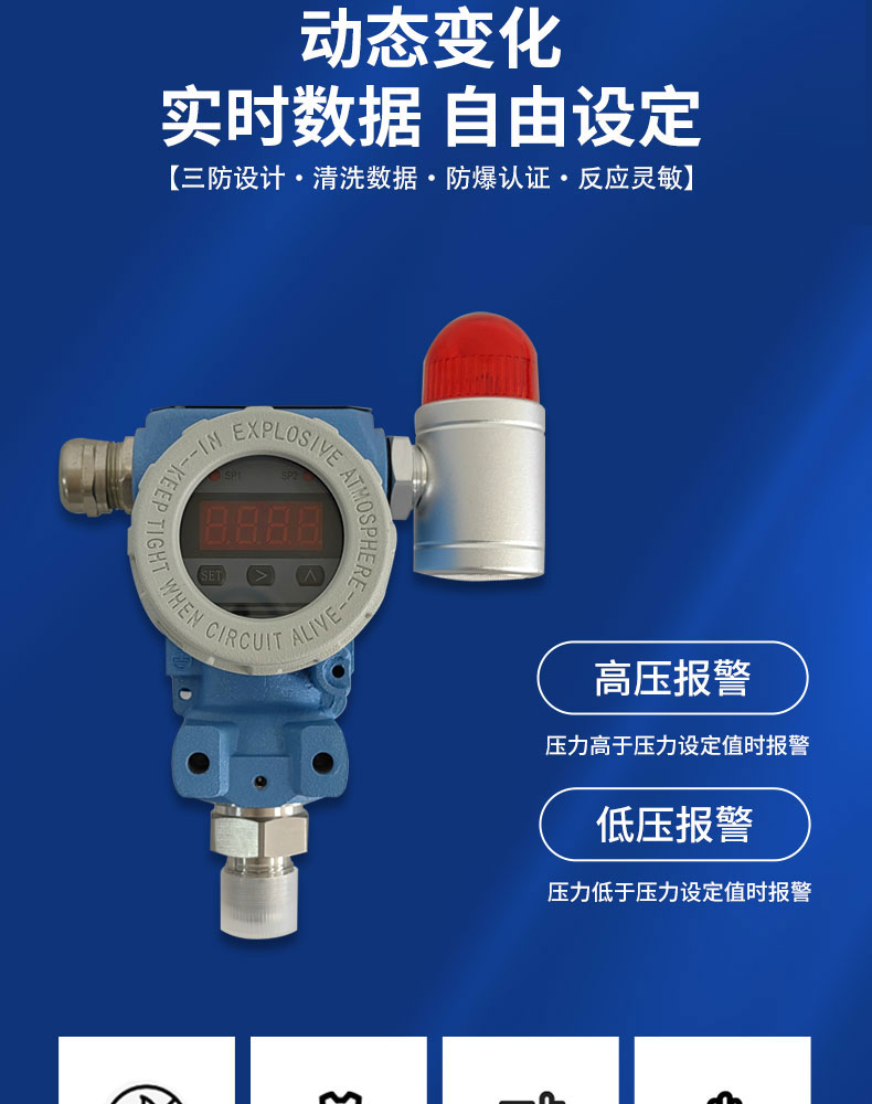 智能压力测控变送产品质量稳定,性能突出,具有非常强的抗干扰特性主要功能包括 4-20mA 变送输出、两路继电器开关量输出、现场显示功能、高低压报警与紧急切断功能。采用 SMT 工艺和集成设计理念,对传感器