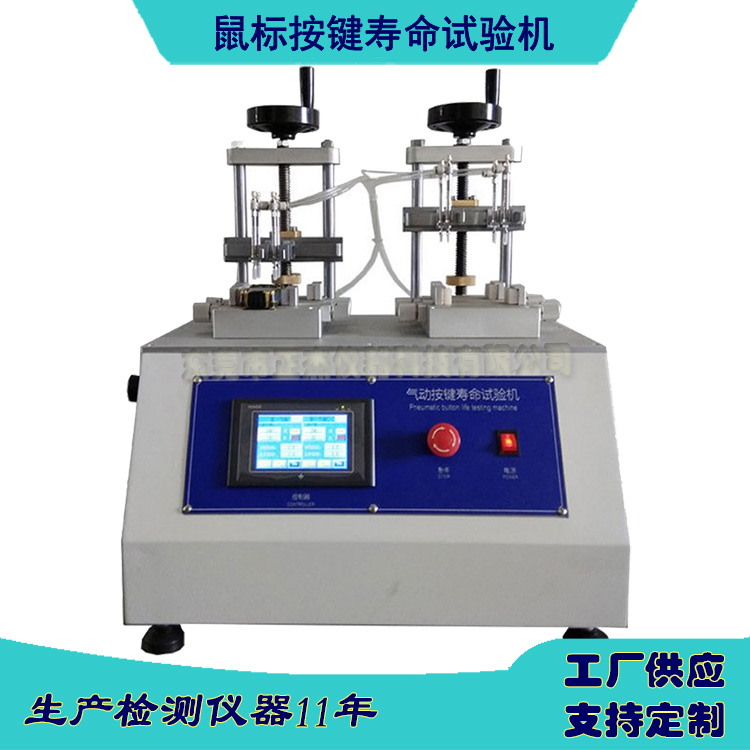 按键寿命试验机适用于手机、电脑键盘、电子词典、蓝牙耳机、车载播放器、摇控器按键、车辆防盗器、打印机传真机按键、MP5、MP4、MP3、按键开关、轻触开关、 薄膜按键、橡胶按键、硅胶按键等各类按键进行按压疲劳寿命试验。本机是将产品分别置 于对应工位的试验位置上,按键测试杆在一定的试验荷重、速度、行程、次数下 模拟人对产品的使用寿命测试。