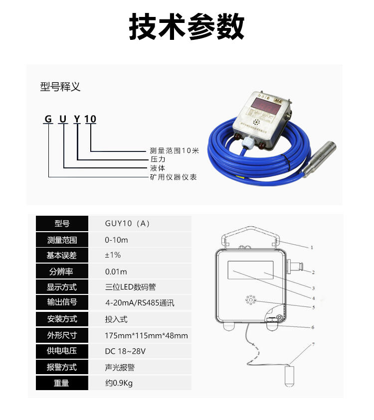 济宁华瑞GUY10(A)煤矿用投入式水位计井下水位监测矿用投入式液位计是采用半导体差压敏感测量探头制成的投入式智能投入式液位测量仪表。该仪器适用于煤矿井下水仓投入式液位的测量以及其它需要测量投入式液位的场所。仪器采用红外线遥控调校,无调节孔,密封性能良好。