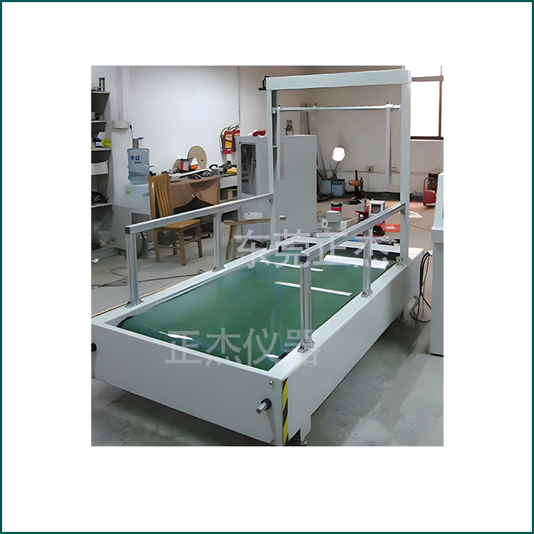 依据CNS手推婴儿车动态耐用试验规范制作。测试方法为:置模型婴儿于车台中,将车台固定于测试台上,调整输送带速度1.4±0.1m/sec(5kw/h±3.6 kw/h)。持续测试64小时后,目视车台有无损坏。