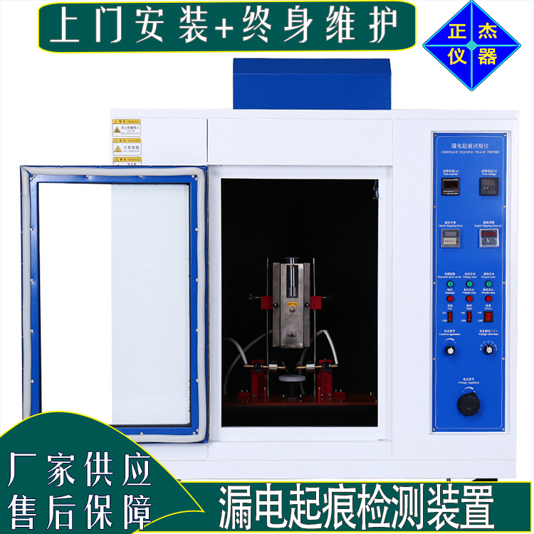 漏电起痕试验是在固体绝缘材料表面上,在规定尺寸的铂电极之间施加某一电压并定时滴下规定液滴体积的导电液体(如0.1%NH4Cl溶液),用以评价固体绝缘材料表面在电场和潮湿或污染介质联合作用下的耐漏电性能。通过测定其相比电痕化指数(CTI)和耐电痕化指数(PTI),可以评估材料的电气安全性能。