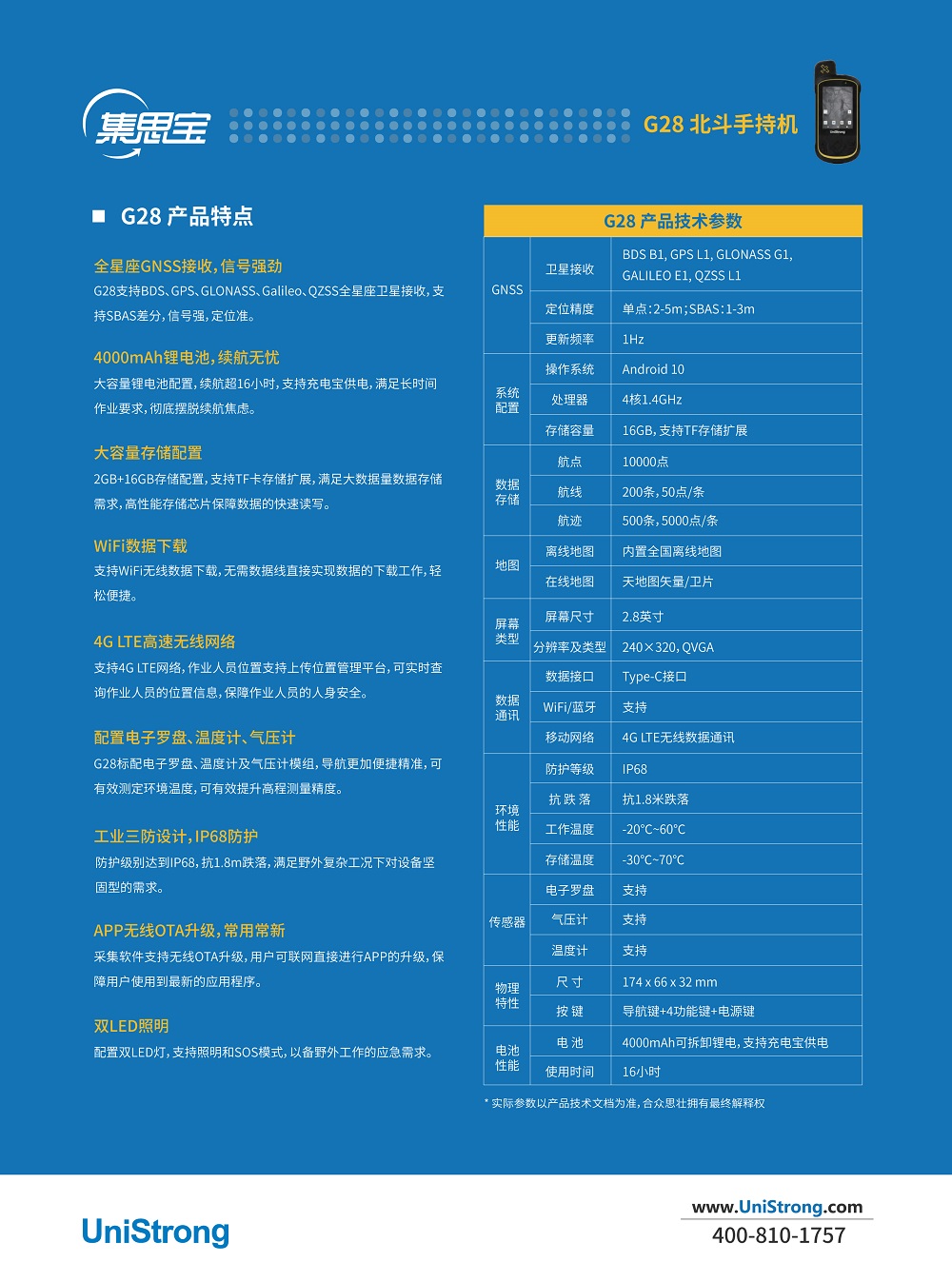 G2系列北斗手持机搭载定位模组,可实现快速精准定位,2.8寸高亮显示大屏,4000mAh大容量锂电池,满足一天高强度作业,定制功能软件支持OTA升级,常用常新。