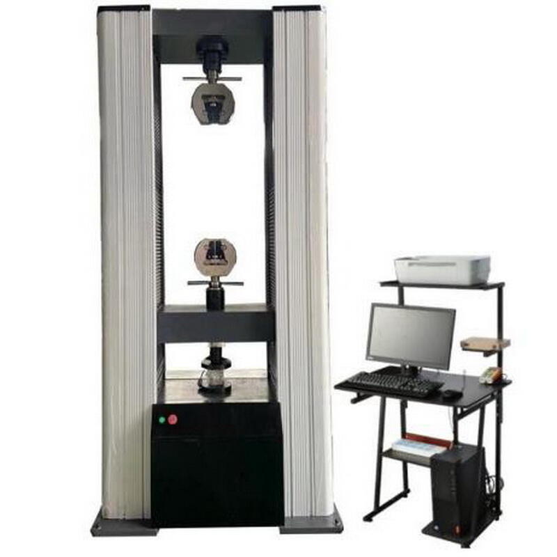 微机控制万能材料试验机采用双空间门式结构,上空间拉伸,下空间压、弯曲等。主机部分由四根导向立柱、上横梁、中横梁、工作台组成落地式框架,调速系统安装在工作台下部。具有调速精度高、范围宽、性能稳定的交流伺服电机通过同步齿形带减速系统带动滚珠丝杠副旋转,滚珠丝杠副驱动中横梁,带动拉伸辅具(或压缩、弯曲等辅具)上下移动,实现试样的加荷与卸载。该结构保证机架有足够的刚度,同时实现高效、平稳传动。精密滚珠丝杠仅承受拉力,有效延长寿命及刚性稳定性.精密丝杠副加载方式,双螺母背紧消间隙,确保系统高刚性及高动态性能。