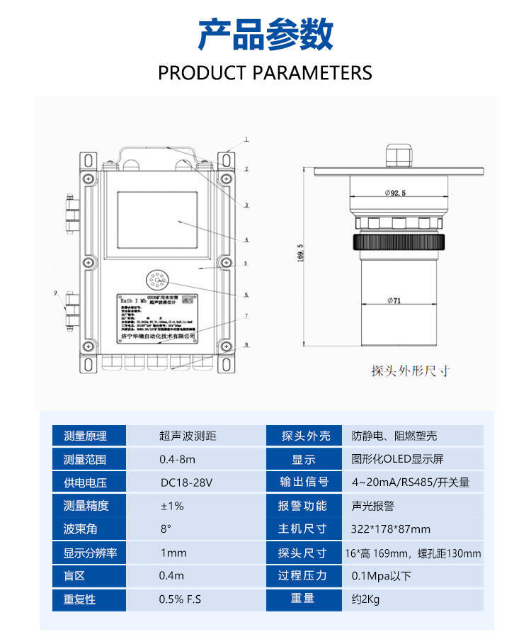 GUC8(A)分体式矿用本安型超声波液位计RS485 4-20mA输出本安型矿用超声波水位计作为济宁华瑞自动化技术有限公司推出的一款专为矿用环境设计的高性能产品,兼具精准测量与安全保障,成为矿山液位监测领域的重要选择。